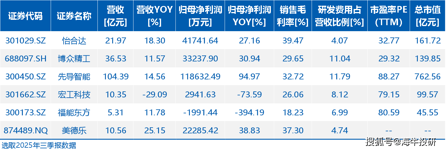 同业业上市公司方面,拔取怡合达(301029)、博众精工(688097)、先导智能(300450)、宏工科技(301662)、福能东方(300173)为可比公司。