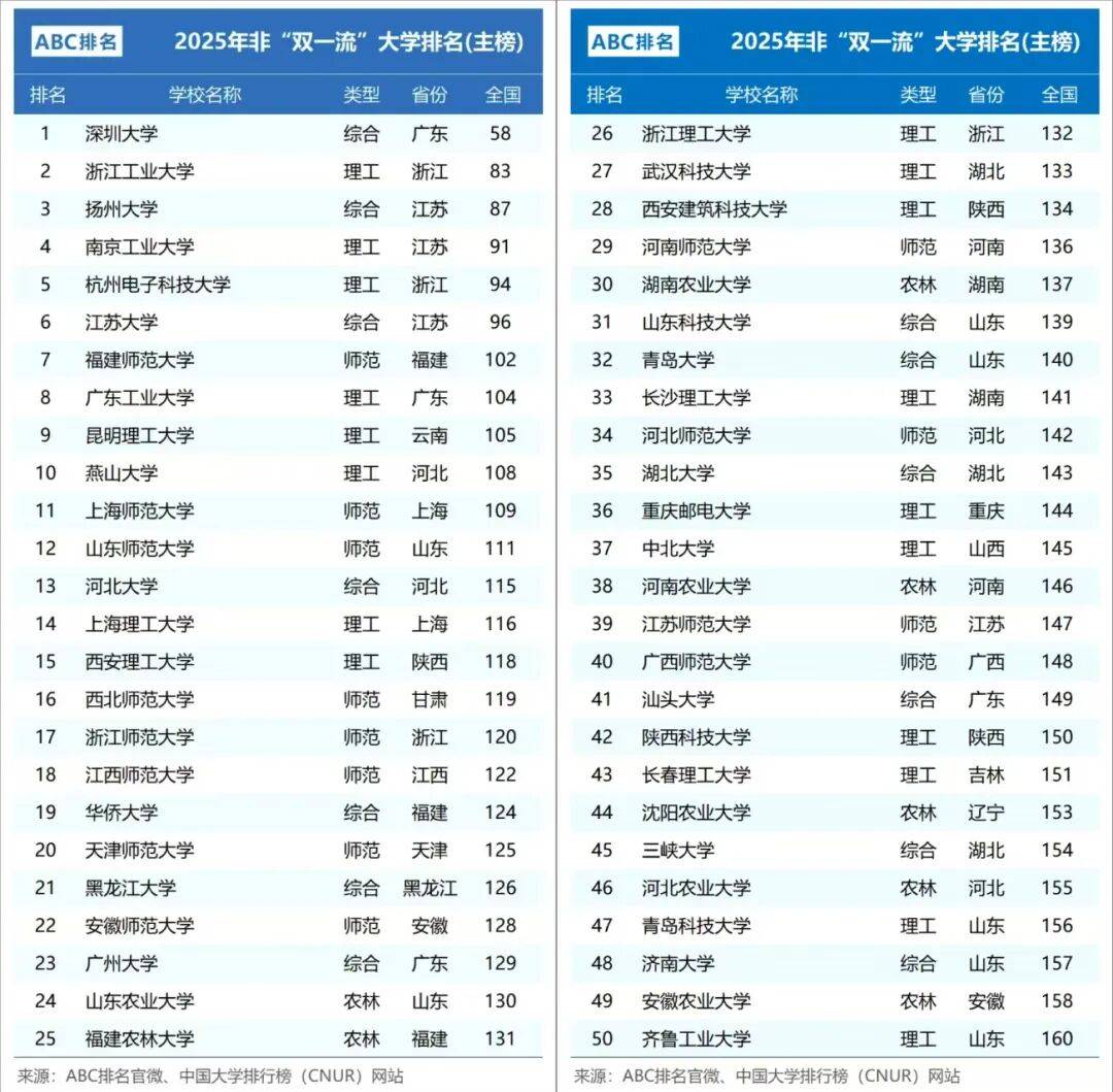 按照国内最具影响力大学排名之一CNUR官网发布的相关数据,2025年排正在我国双非高校第1名的为深圳大学。可是,学校各方面实力取就业均已不比一般的211高校差,结业生良多都是界500强企业就业。