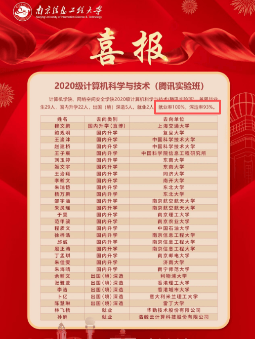 通信工程-华为尝试班升学率高达93%,20人被复旦大学、中国科学院大学等顶尖高校登科,6人出国留学,去向落实率100%;计较机科学取手艺-腾讯云尝试班境表里深制率更是达到97%,29名结业生中28人成功升学,此中10人保研至上海交通大学、复旦大学等985高校,12人考研至中国科学手艺大学等名校,6人斩获利物浦大学等海外名校offer。